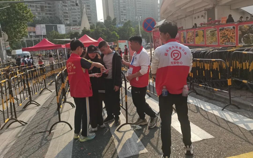 他们驻守在场外各个关键点位,是观众安全抵达的引路人。在十字路口,他们配合交警疏导车流,细心搀扶老人、孩童平安过街;在接驳站,他们耐心指引、清晰讲解,让每位观众快速找准入口。