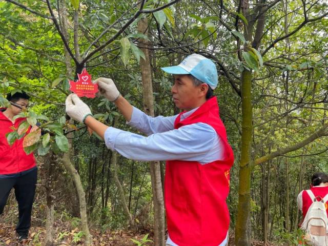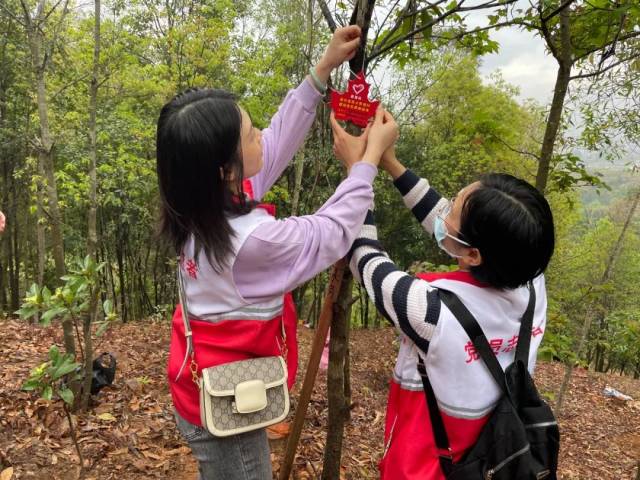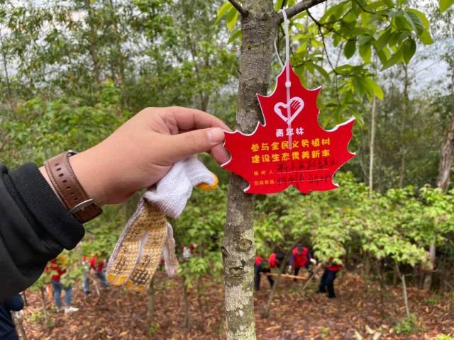 志愿者们将“青年林”创森寄语卡挂在树苗上