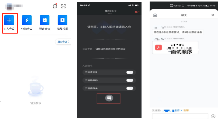 (1)面试签到:报考志愿者在面试当日上午08:00---08:30之间(面试开始前)登录腾讯会议APP,点击“加入会议”进入等候室(会议号码及分组由各县(市、区)项目办另通知),点击下方聊天图标,可查看面试顺序及面试进度,操作如下图: