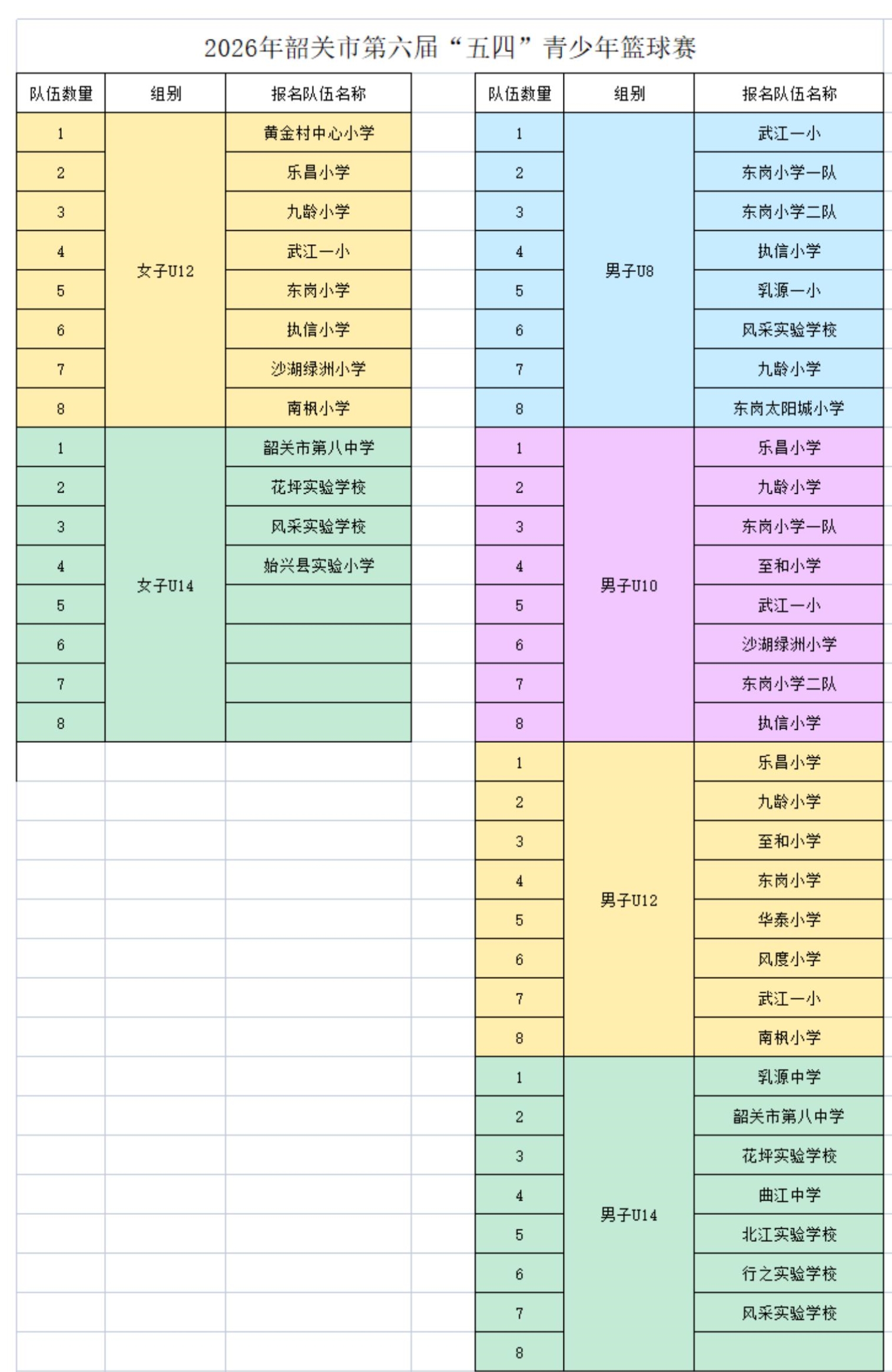 2026年韶关市第六届“五四”青少年篮球赛报名名单